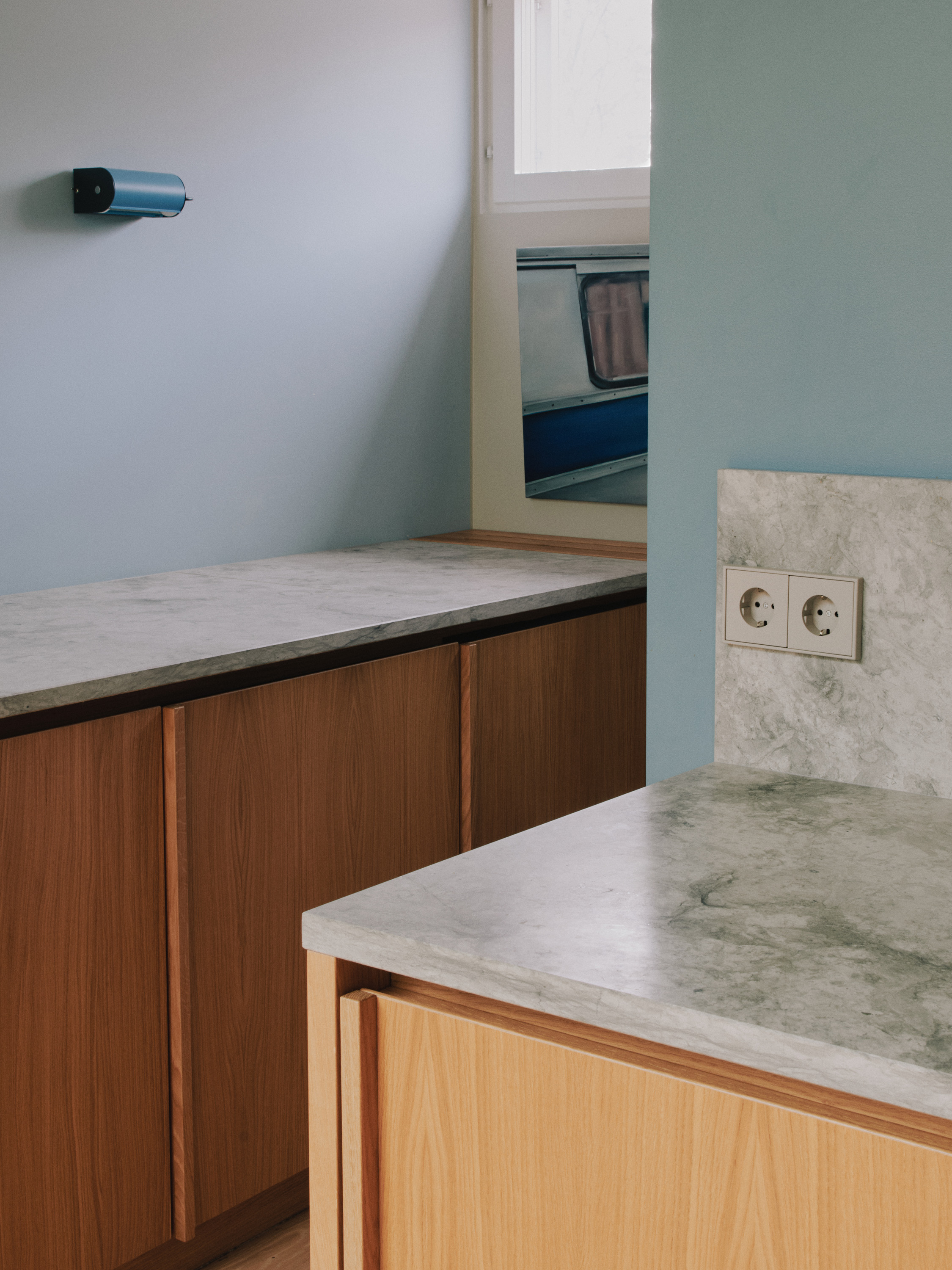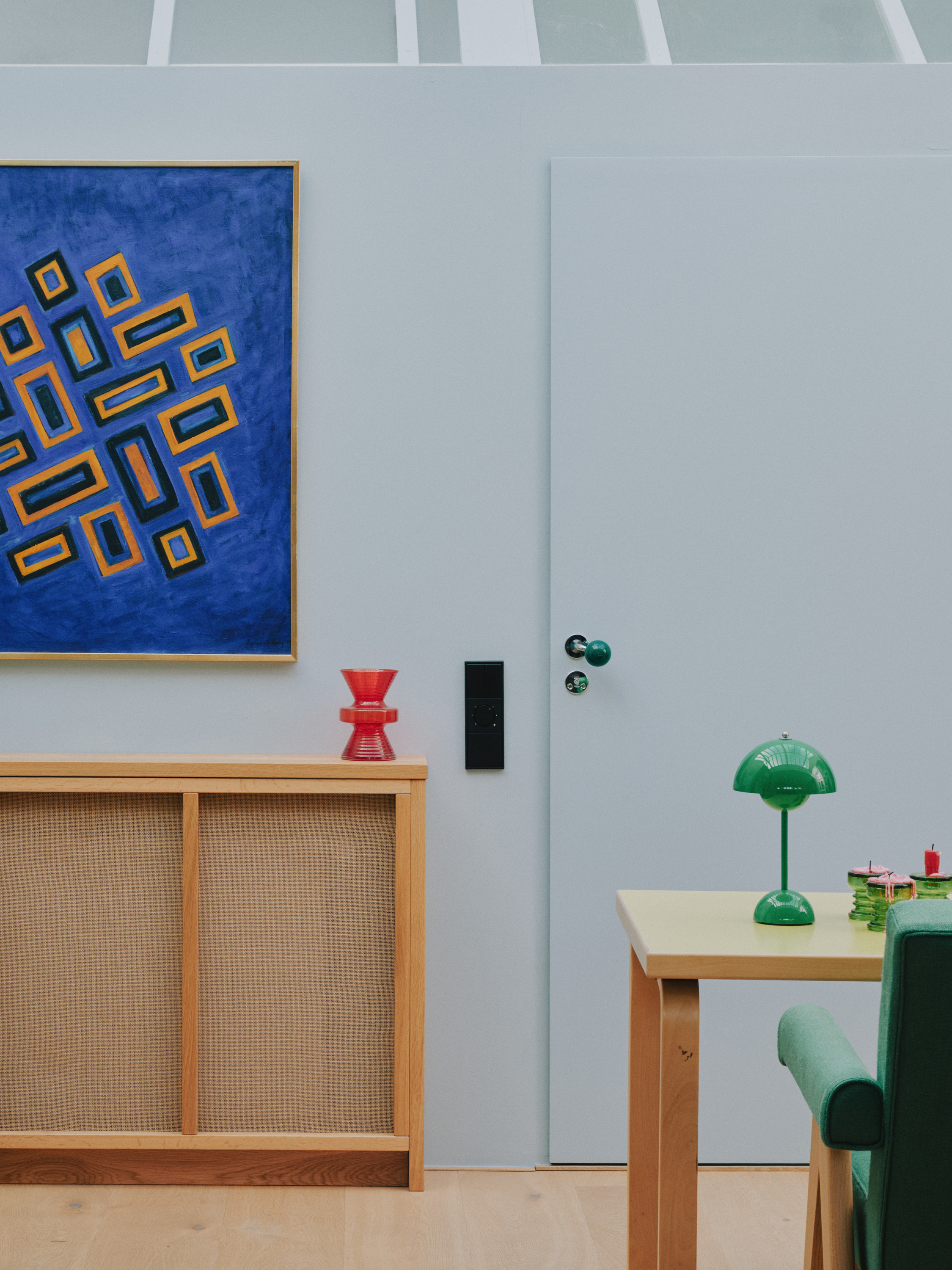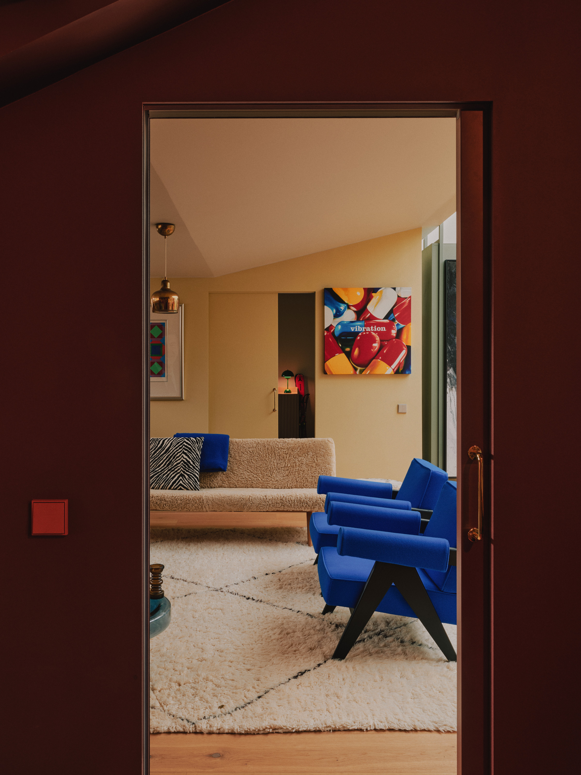 The apartment’s large skylights, exposed structures and 1980s detailing provided the framework for the new interior. The client wished for a colourful home with minimal use of white, leading to a room-specific colour concept. Electrical outlets and light switches were selected in different hues to correspond with each room’s palette—an uncommon but precise detail that reinforces visual coherence. Circulation was refined to achieve a more intuitive and functional layout.