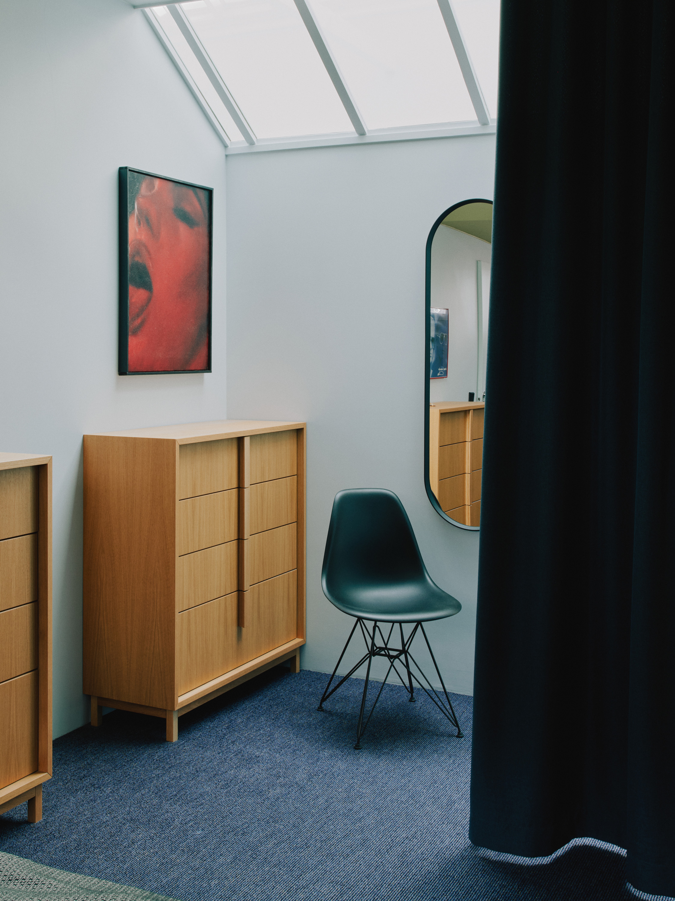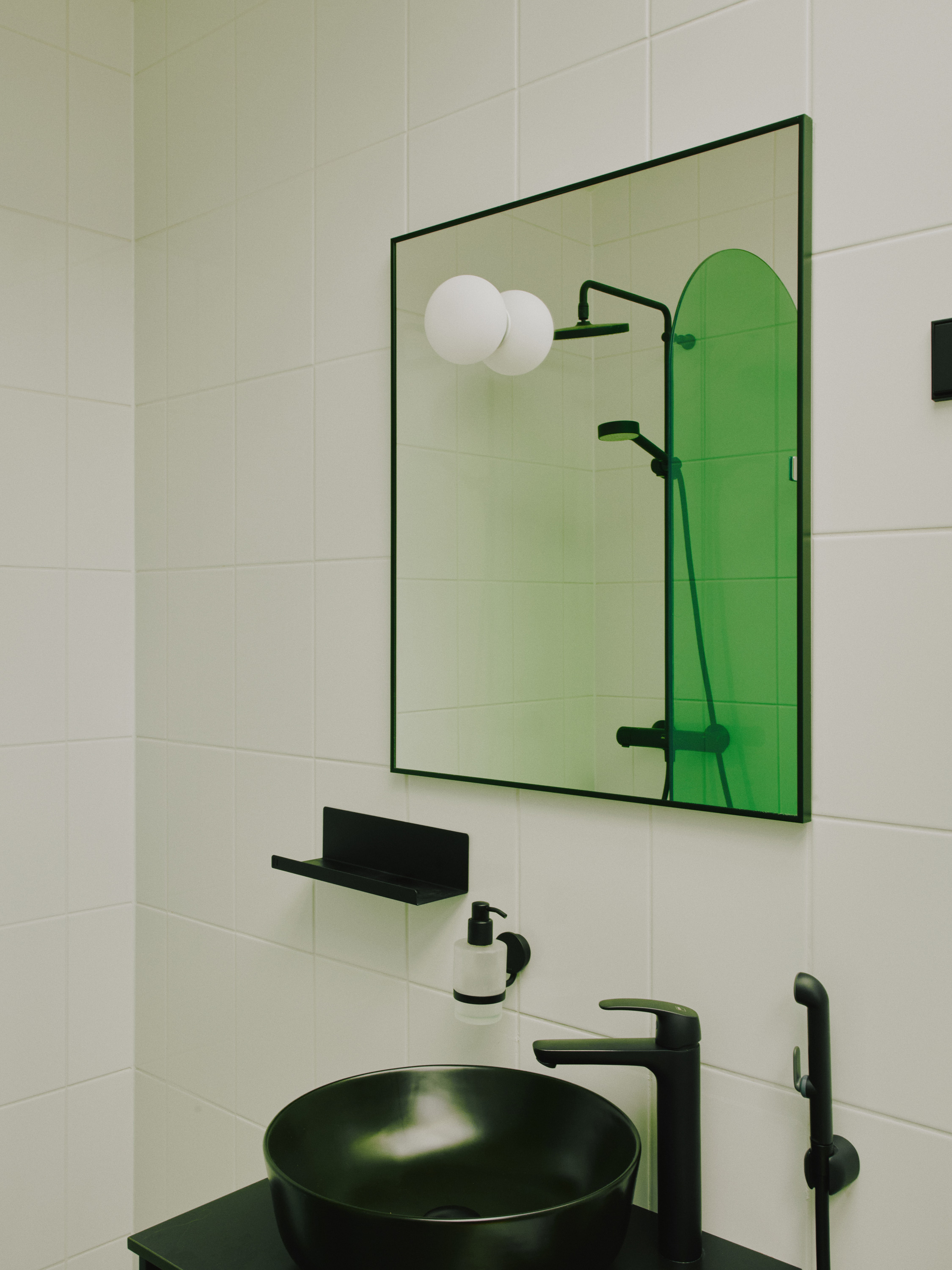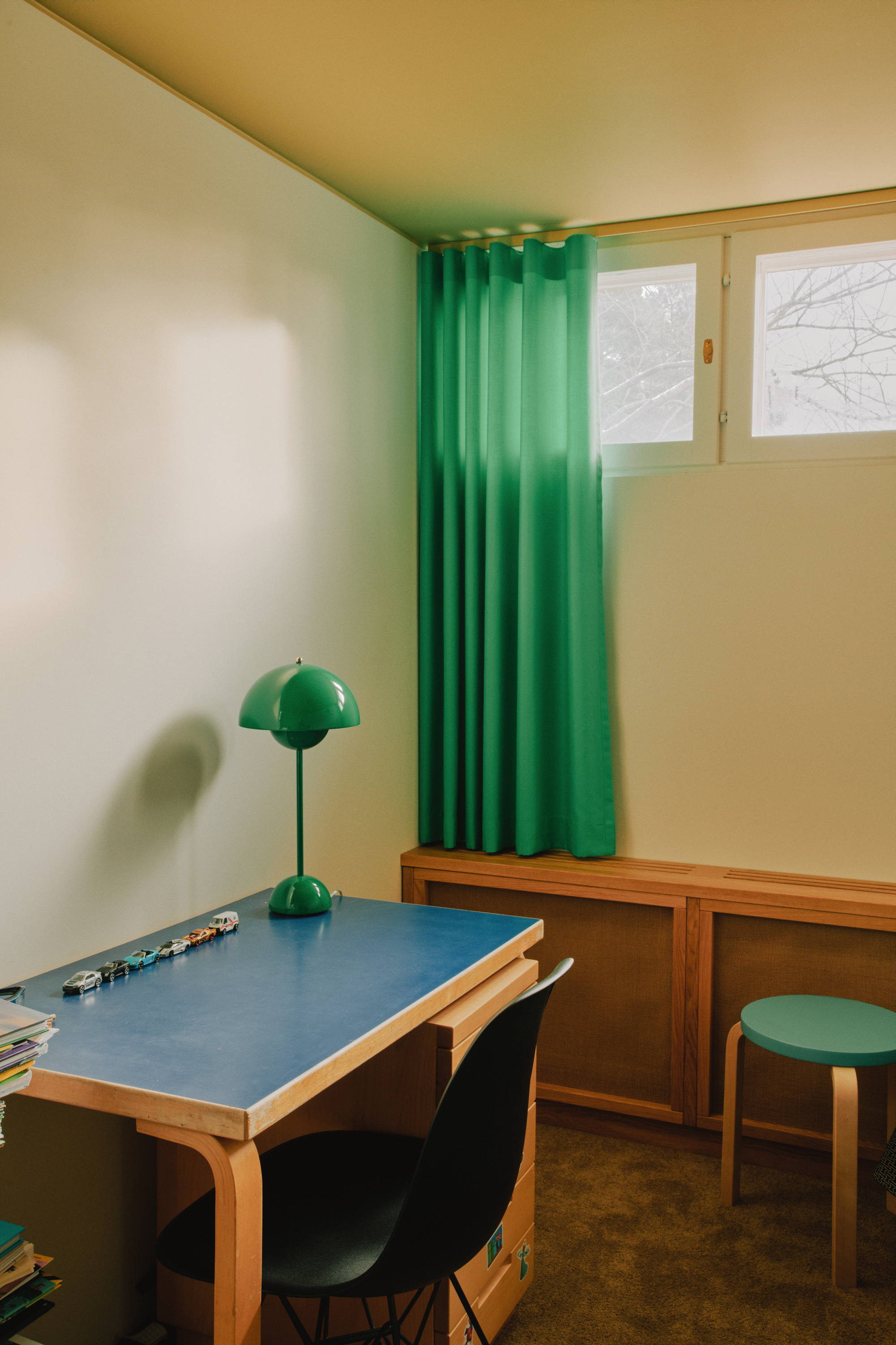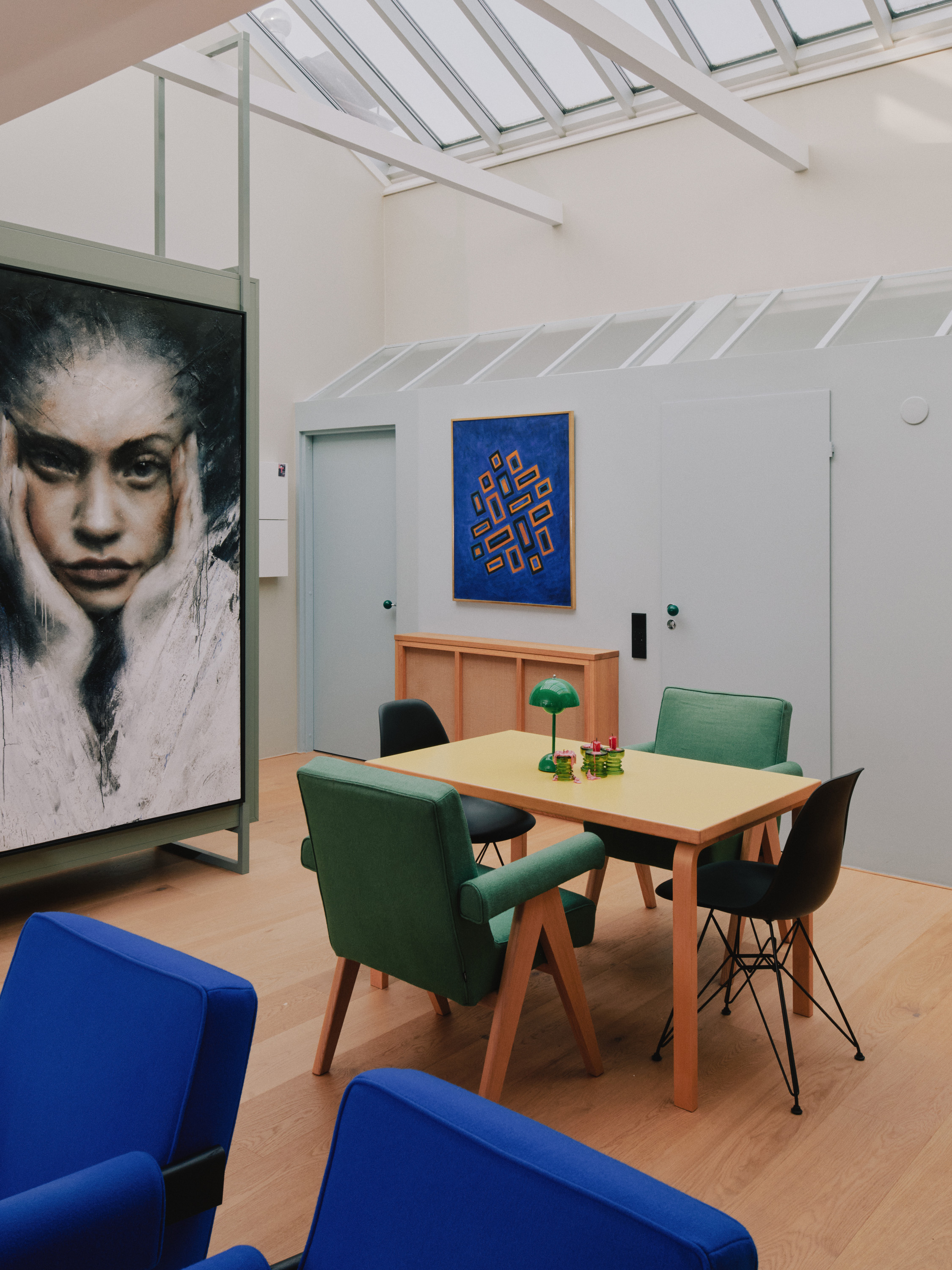 The apartment’s large skylights, exposed structures and 1980s detailing provided the framework for the new interior. The client wished for a colourful home with minimal use of white, leading to a room-specific colour concept. Electrical outlets and light switches were selected in different hues to correspond with each room’s palette—an uncommon but precise detail that reinforces visual coherence. Circulation was refined to achieve a more intuitive and functional layout.