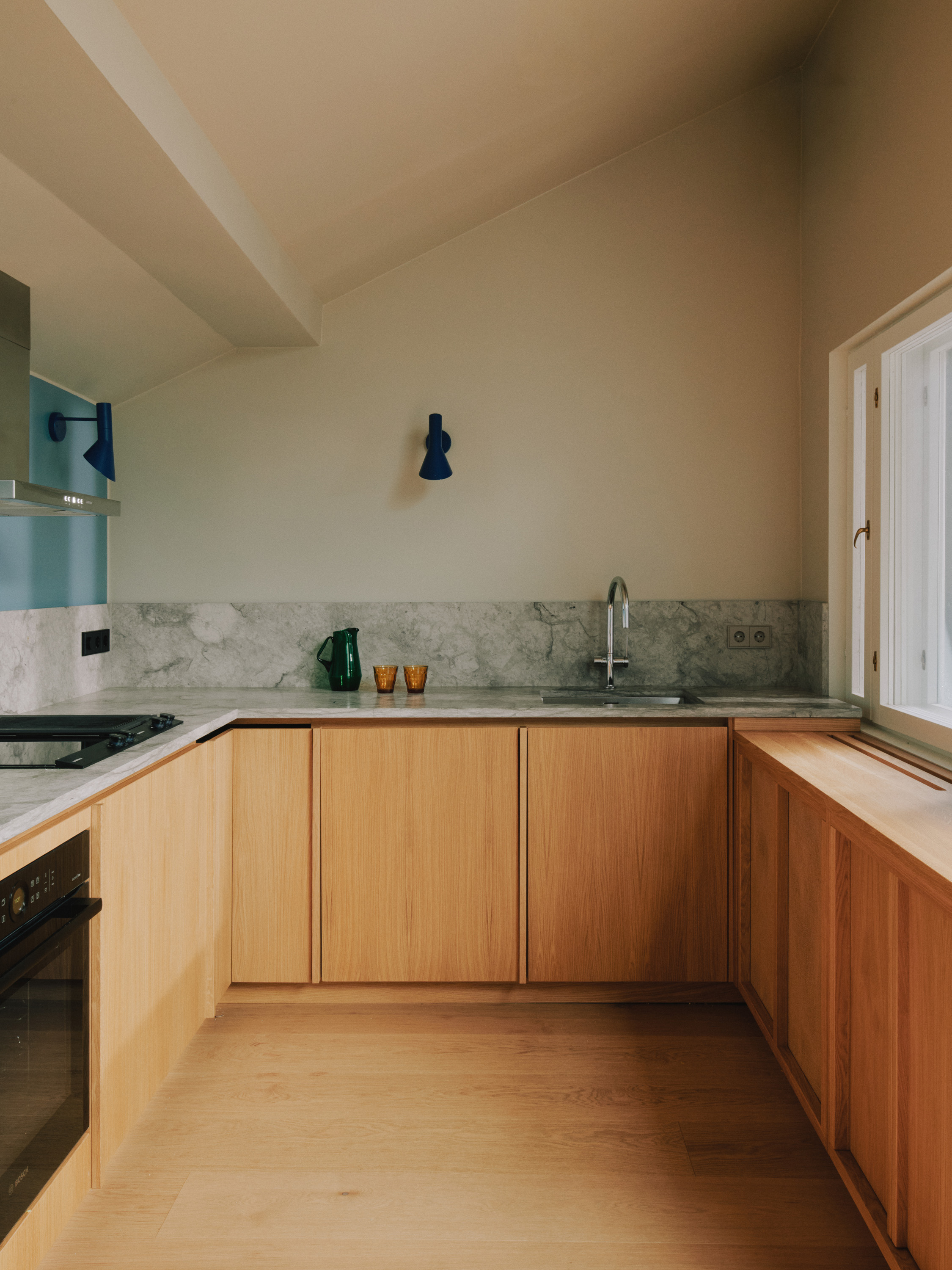 A complete renovation of a private attic apartment in Meilahti. Located in a 1951 building, the apartment was added as a conversion in 1985. Its design differs from the original mid-century units, giving it a distinct character within the neighbourhood. The area’s leafy urban fabric, restrained mid-20th-century architecture and calm atmosphere informed the design approach.