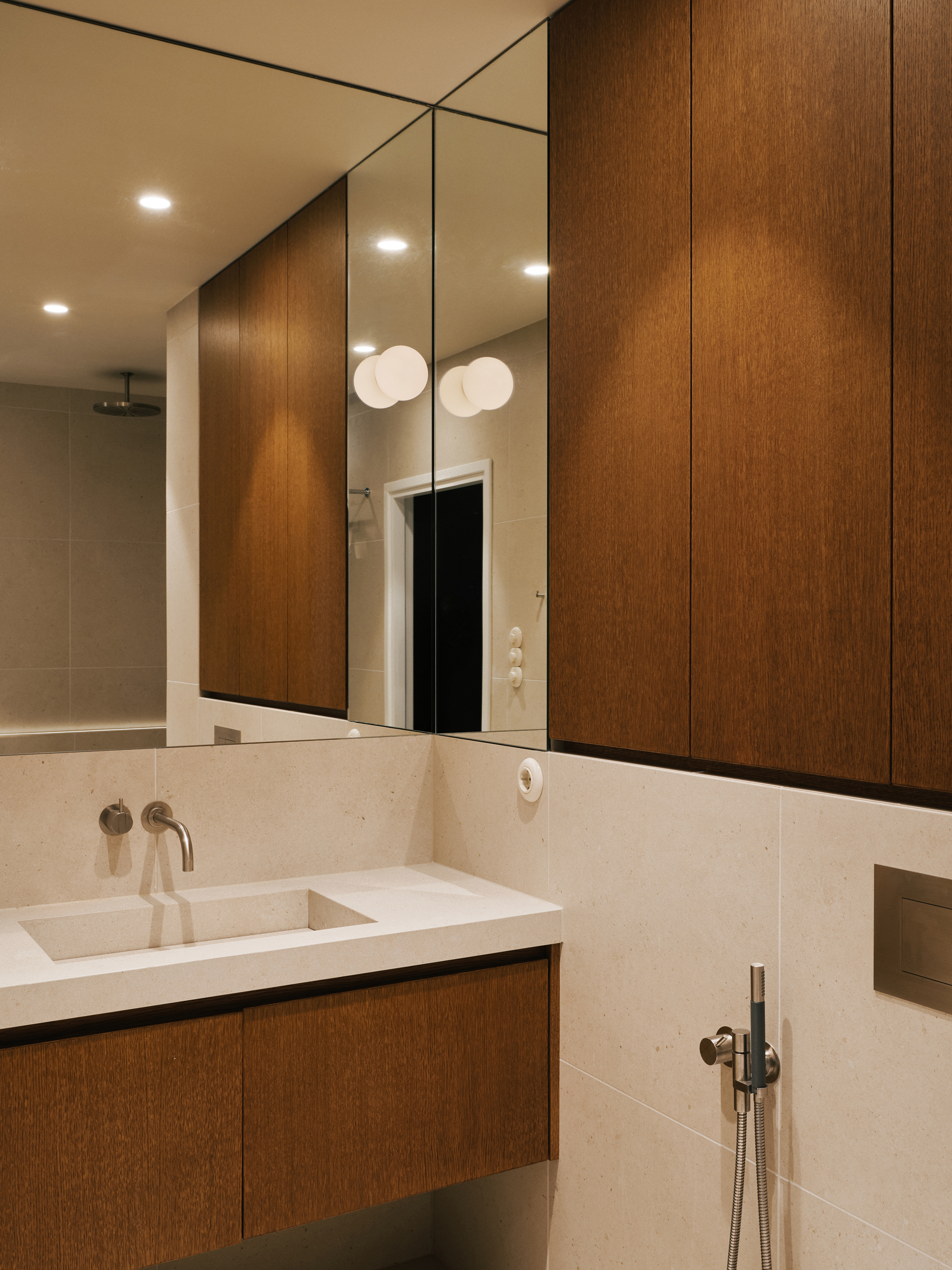 The interior design incorporates the clients’ existing and recycled furniture, adding character while supporting sustainable design principles. A minimalist approach is reflected in the clean lines and calm surfaces. The bathroom areas were fully modernized with a refined finish, and the layout was tailored to suit family life, including utility room and dedicated space for children. The result is a comfortable and balanced home where aesthetics and functionality meet.